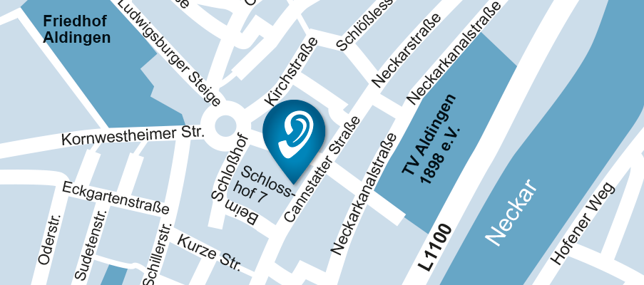 Unsere iffland.hören. Filiale Remseck-Aldingen finden Sie Schlosshof 7, direkt im Ortszentrum. Das Hörgeräte-Fachgeschäft ist nur wenige Minuten vom Sportplatz des TV Aldingen e.V. und der evangelischen Krichengemeinde Aldingen entfernt. Wir würden uns freuen, Sie in unserer iffland.hören. Filiale in der Stadt mit zwei Flüssen, Remseck-Aldingen begrüßen zu dürfen.