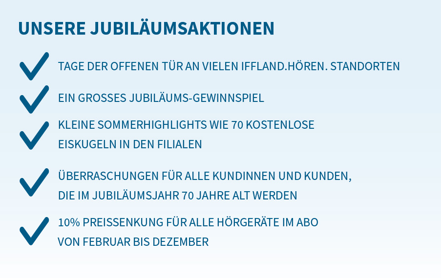 70 Jahre iffland.hören., das ist etwas ganz Besonderes. Aber noch besonderer sind die Menschen, die uns seit Jahrzehnten begleiten. Ohne das Vertrauen und die Treue unserer Kundinnen und Kunden gäbe es dieses Jubiläum nicht. Genau deshalb feiern wir nicht einfach ein Datum, sondern wir feiern gemeinsam.
